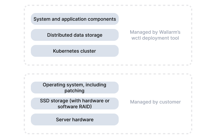 The following diagram shows which layers of the Wallarm Cloud system are managed via wctl and which require customer management: