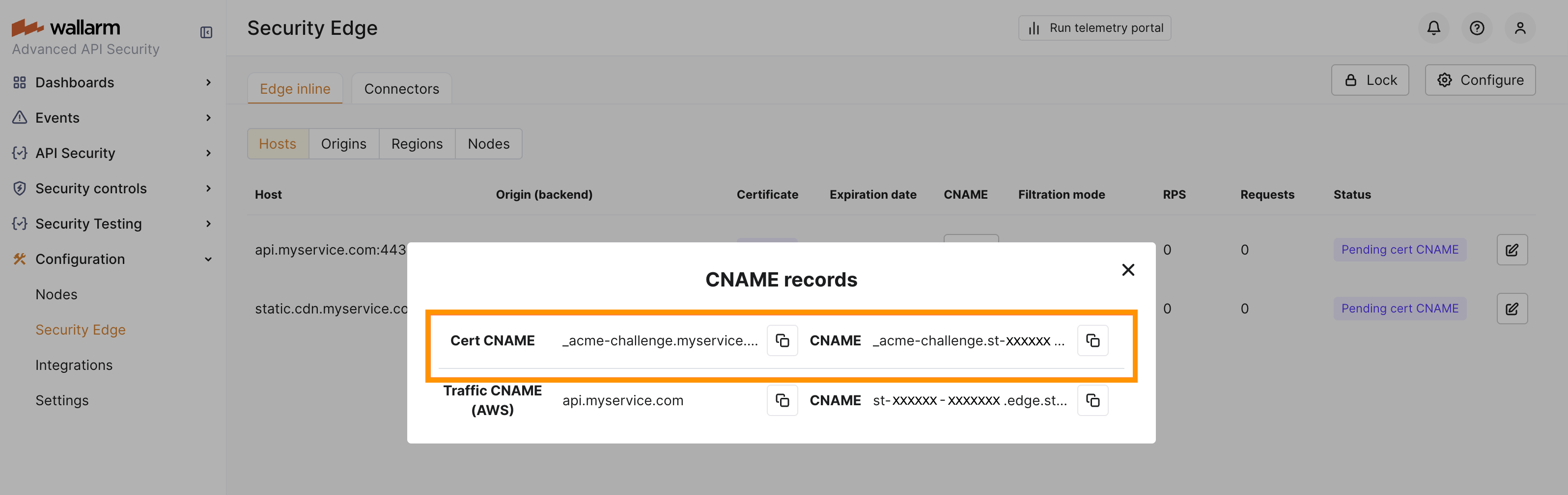 Once configuration is complete, Wallarm provides a CNAME for each DNS zone. Add this CNAME record to your DNS settings to verify domain ownership and complete the certificate issuance process.