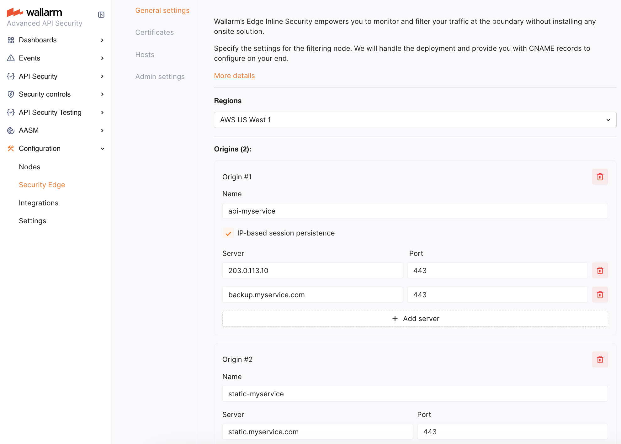 Specify origins to which the Edge Node will forward filtered traffic. For each origin, provide a server IP address or FQDN with an optional port (default: 443).