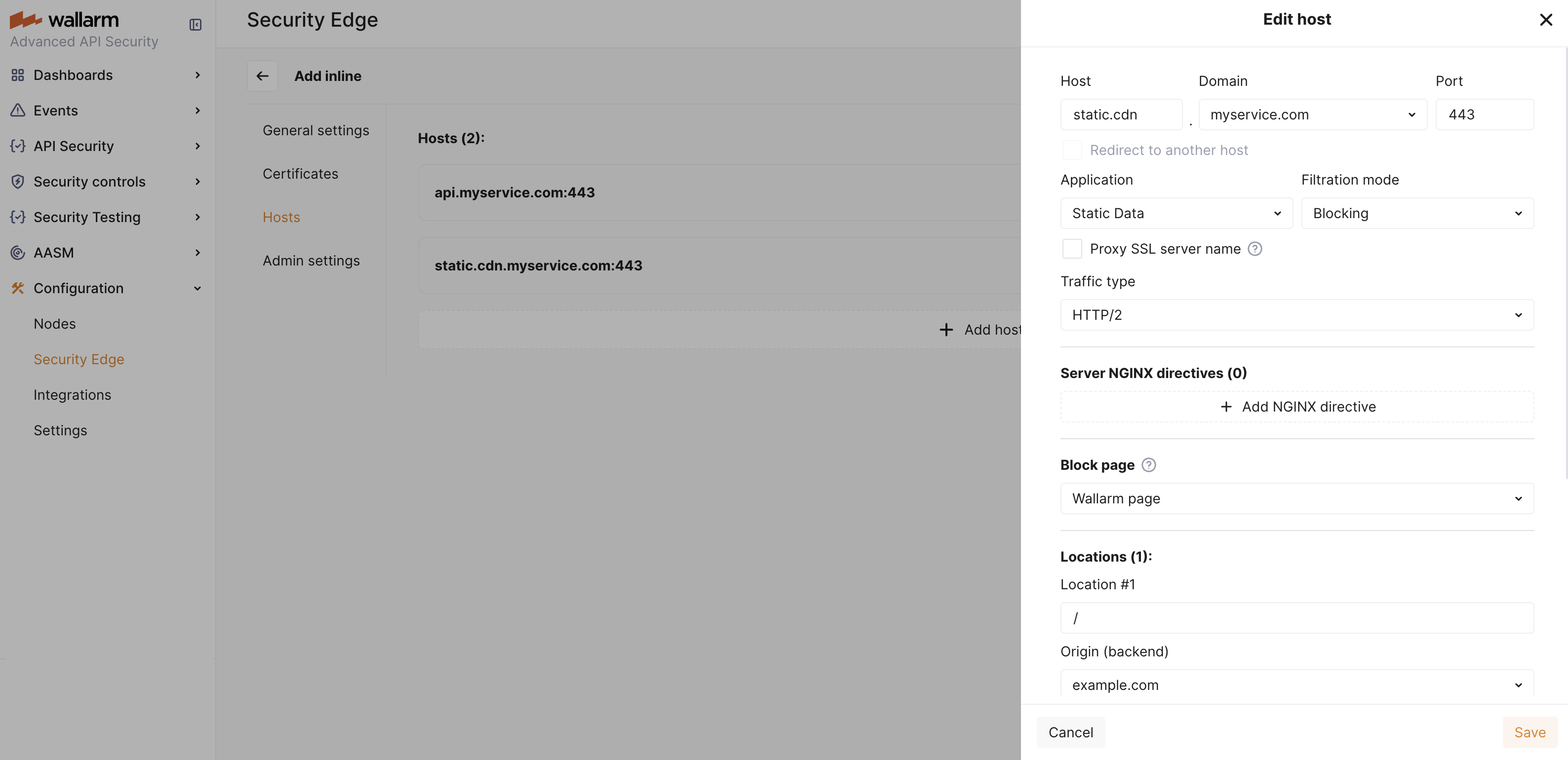 /):- Origin where the Wallarm Node will forward the filtered traffic (if no other location-specific settings are defined). The location's path is automatically appended to the origin.