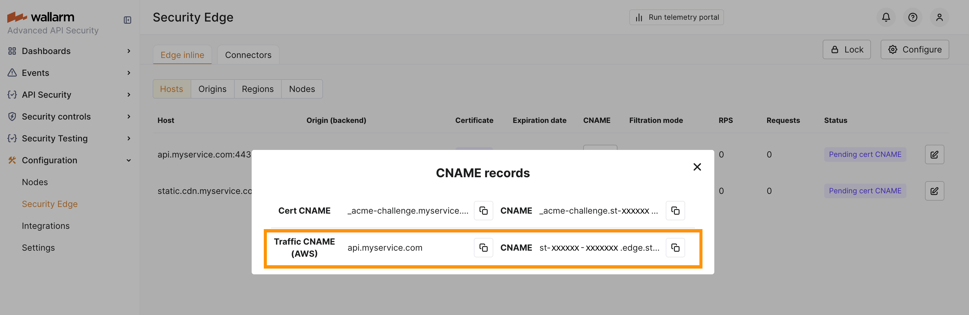 DNS changes can take up to 24 hours to propagate. Wallarm starts the Edge Node deployment once the CNAME records are verified (if needed).