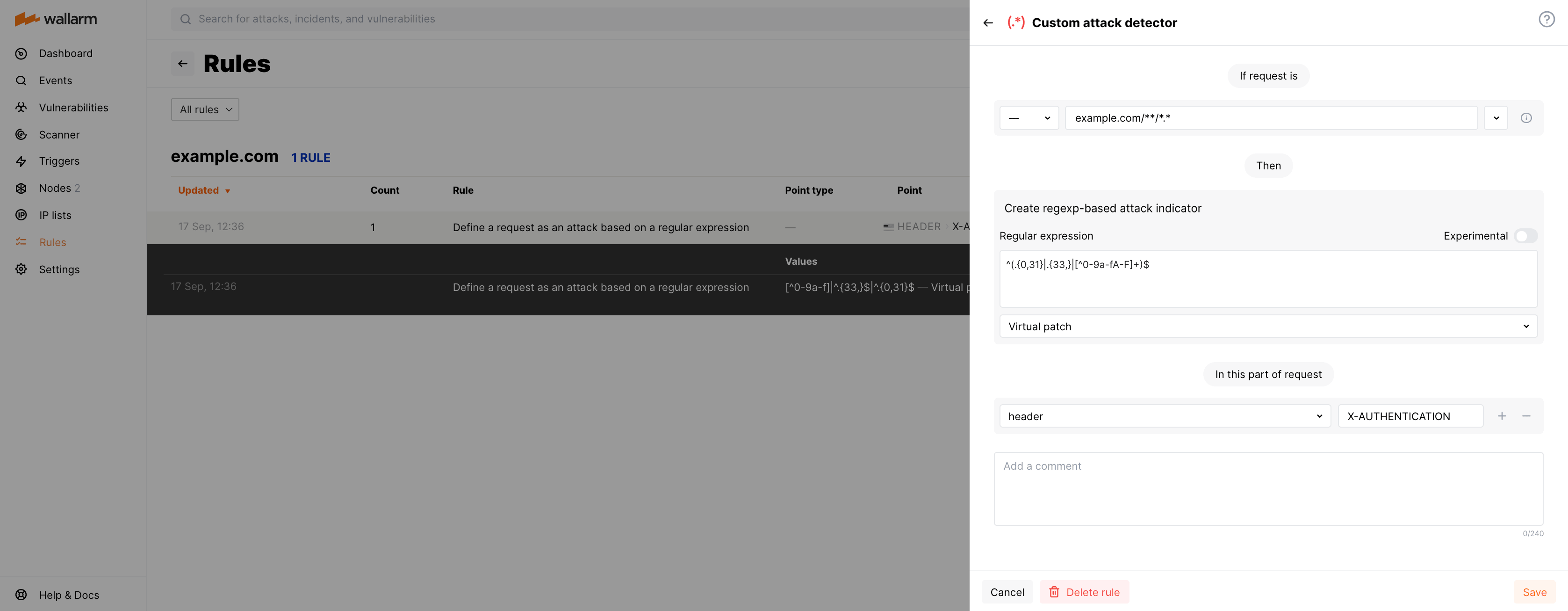 To do so, set the Create regexp-based attack indicator rule and set it to Virtual patch as displayed on the screenshot, including: