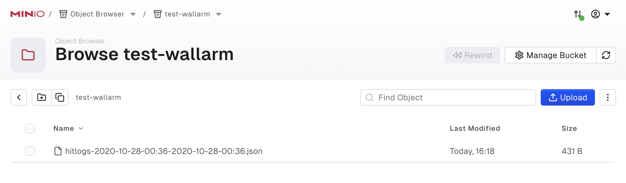 To review the data in your bucket, open the bucket in the MinIO Console and use Object Browser:
