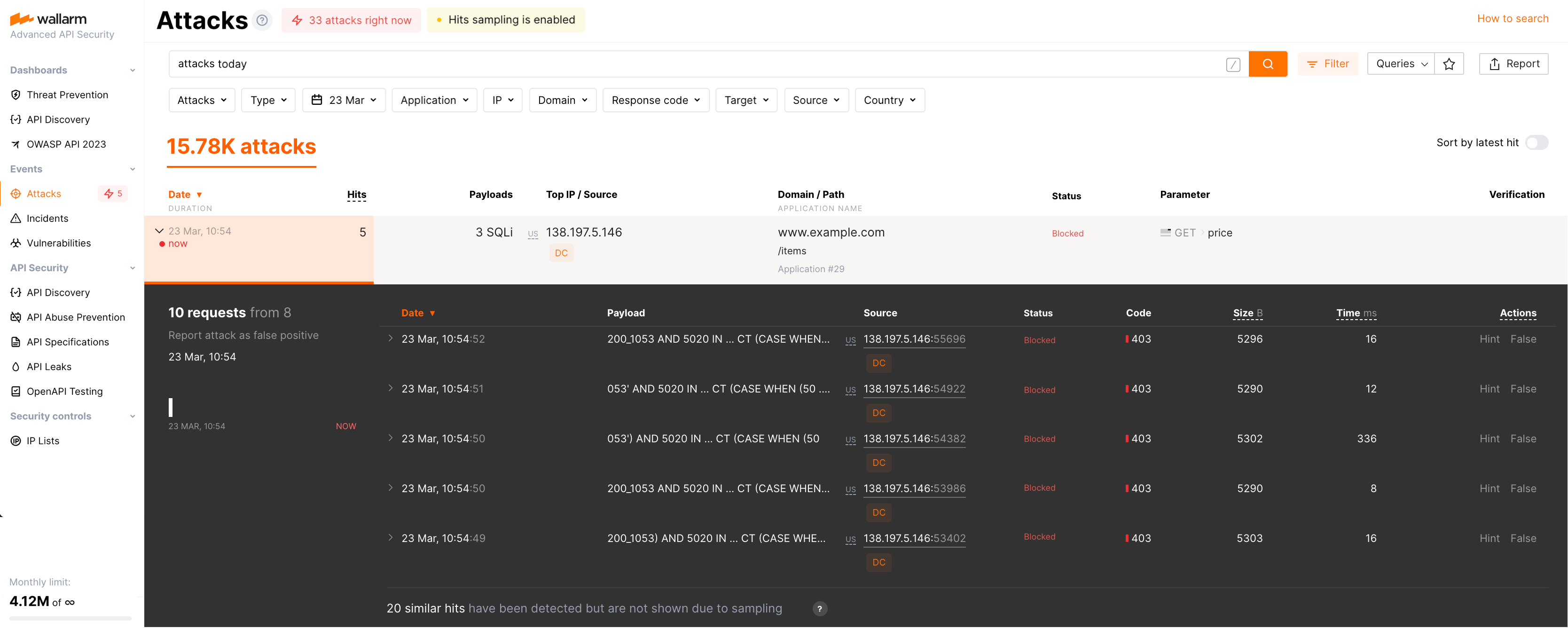 The Hits sampling is enabled notification shows that sampling works now. You can click this notification or add sampled to the search field to see only attacks that sampling was applied to. In the attack details you will see how many similar hits were detected but not displayed: